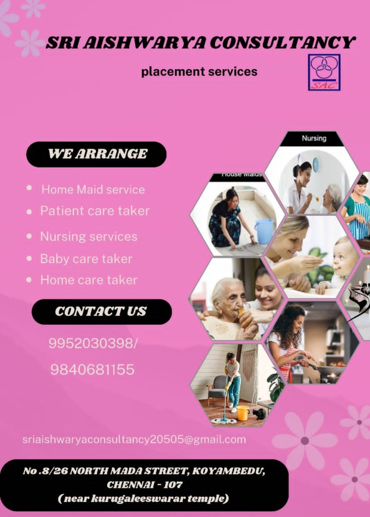 Sri Aishwarya Consultancy Started month of september month 2004. we are provide qualified 100% Reliable Home Nurses, Patient Care Takers.